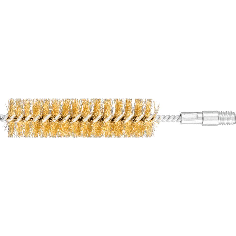 Speziell zum Entgraten und Reinigen von Rohren, Gewinden, Muffen und Zylindern geeignet. Bürsten mit Besatzmaterial Messingdraht eignen sich für besondere Anwendungsbereiche wie dem Oberflächenfinish an Werkstücken aus Kupfer und Messing. Messingdraht ist im Vergleich zu Stahldraht weicher und flexibler. PFERD TOOLS verwendet bei allen Bürsten mit Messingdraht die Drahtqualität CuZn37. Messingdraht hält Temperaturen bis 180 °C stand. Neben dem Gewinde verfügt diese Innenbürste zusätzlich über einen 10 mm Schaftansatz.