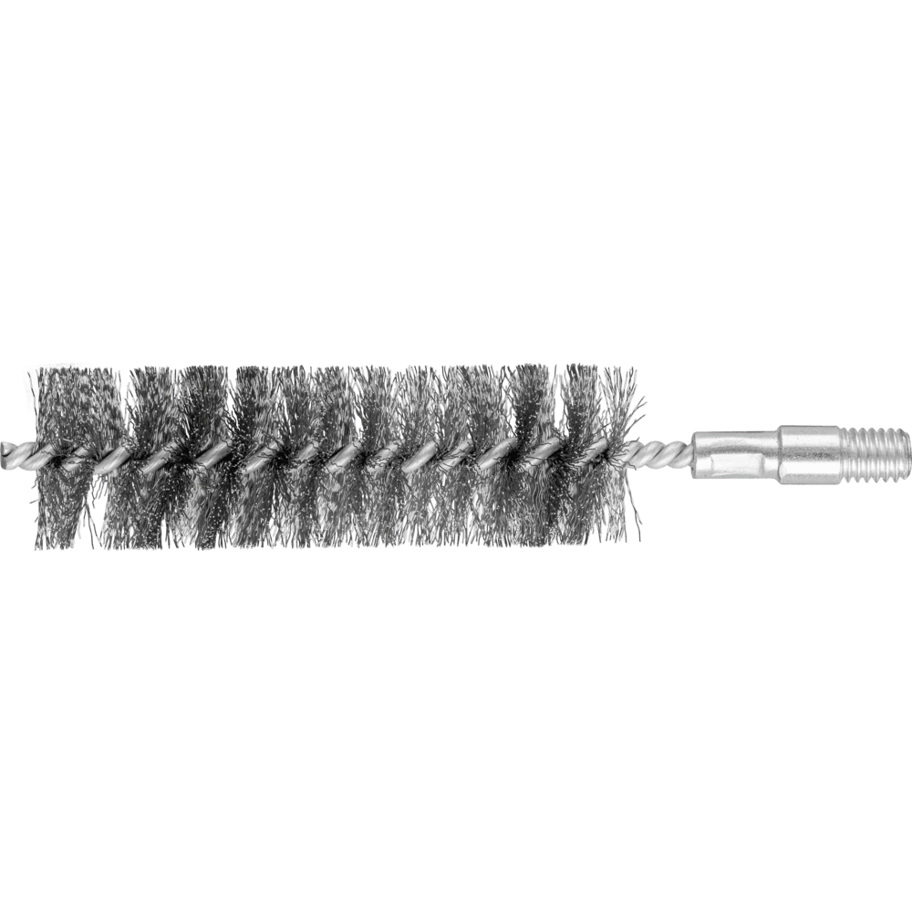 Speziell zum Entgraten und Reinigen von Rohren, Gewinden, Muffen und Zylindern geeignet. Um die besonderen Ansprüche bei der Bearbeitung von Edelstahl (INOX) zu erfüllen, verwendet PFERD TOOLS bei allen INOX-Bürsten die Drahtqualität 1.4310 (V2A). Praxiserfahrungen aus dem industriellen Umfeld bestätigen, dass sie eine sehr gute Korrosionsbeständigkeit bei optimaler Standzeit aufweist. Alle PFERD TOOLS Bürsten mit INOX-Besatz sind blau gekennzeichnet und für den Einsatz auf allen Edelstählen (INOX), wie z. B. V4A, geeignet. Die Drahtqualität 1.4310 neigt bei Kaltverfestigung zu ferromagnetischem Verhalten, das heißt, sie wird von Magneten angezogen.;Ursache hierfür ist eine Gefügeveränderung, die durch Verformung, z. B. während des Drahtziehens, hervorgerufen wird. Dies hat keinen Einfluss auf die Qualität und Korrosionsbeständigkeit des INOX-Besatzes. Er behält seine korrosionsbeständigen Eigenschaften. Edelstahldraht (INOX) hält Temperaturen bis 450 °C stand. Neben dem Gewinde verfügt diese Innenbürste zusätzlich über einen 10 mm Schaftansatz.