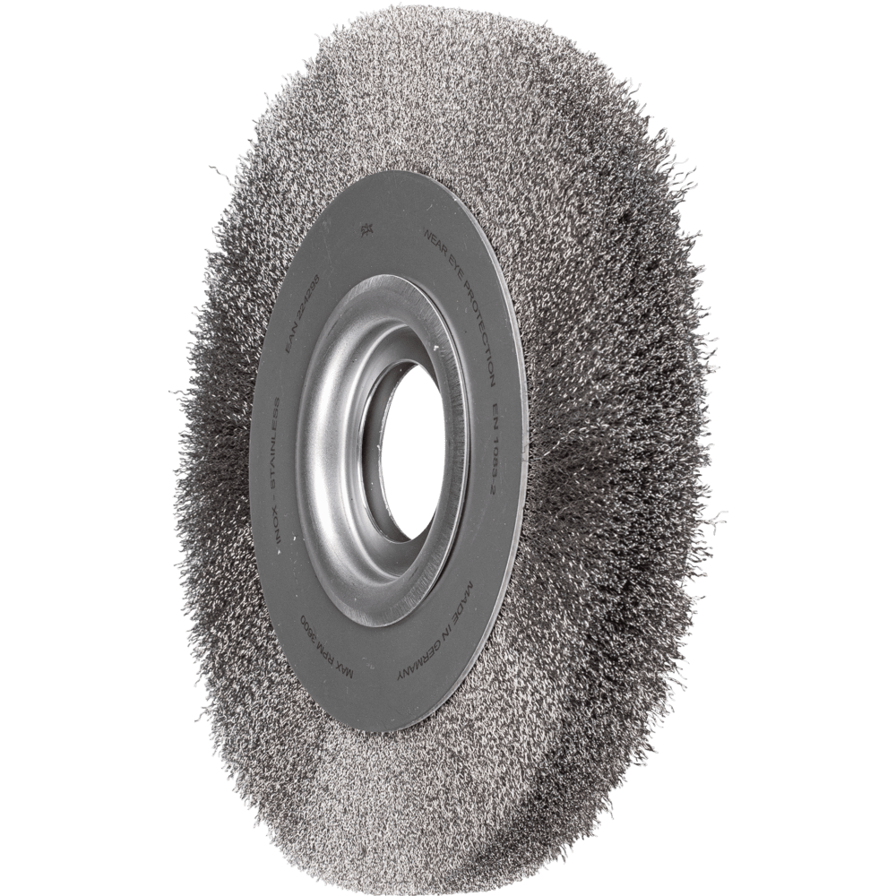 Hervorragend für mittelschwere Bürstarbeiten auf großflächigen Werkstücken im handgeführten und maschinellen Einsatz geeignet. Um die besonderen Ansprüche bei der Bearbeitung von Edelstahl (INOX) zu erfüllen, verwendet PFERD TOOLS bei allen INOX-Bürsten die Drahtqualität 1.4310 (V2A). Praxiserfahrungen aus dem industriellen Umfeld bestätigen, dass sie eine sehr gute Korrosionsbeständigkeit bei optimaler Standzeit aufweist. Alle PFERD TOOLS Bürsten mit INOX-Besatz sind blau gekennzeichnet und für den Einsatz auf allen Edelstählen (INOX), wie z. B. V4A, geeignet. Die Drahtqualität 1.4310 neigt bei Kaltverfestigung zu ferromagnetischem Verhalten, das heißt, sie wird von Magneten angezogen.;Ursache hierfür ist eine Gefügeveränderung, die durch Verformung, z. B. während des Drahtziehens, hervorgerufen wird. Dies hat keinen Einfluss auf die Qualität und Korrosionsbeständigkeit des INOX-Besatzes. Er behält seine korrosionsbeständigen Eigenschaften. Edelstahldraht (INOX) hält Temperaturen bis 450 °C stand. Für den universellen Einsatz im Werkstattbereich entwickelt.