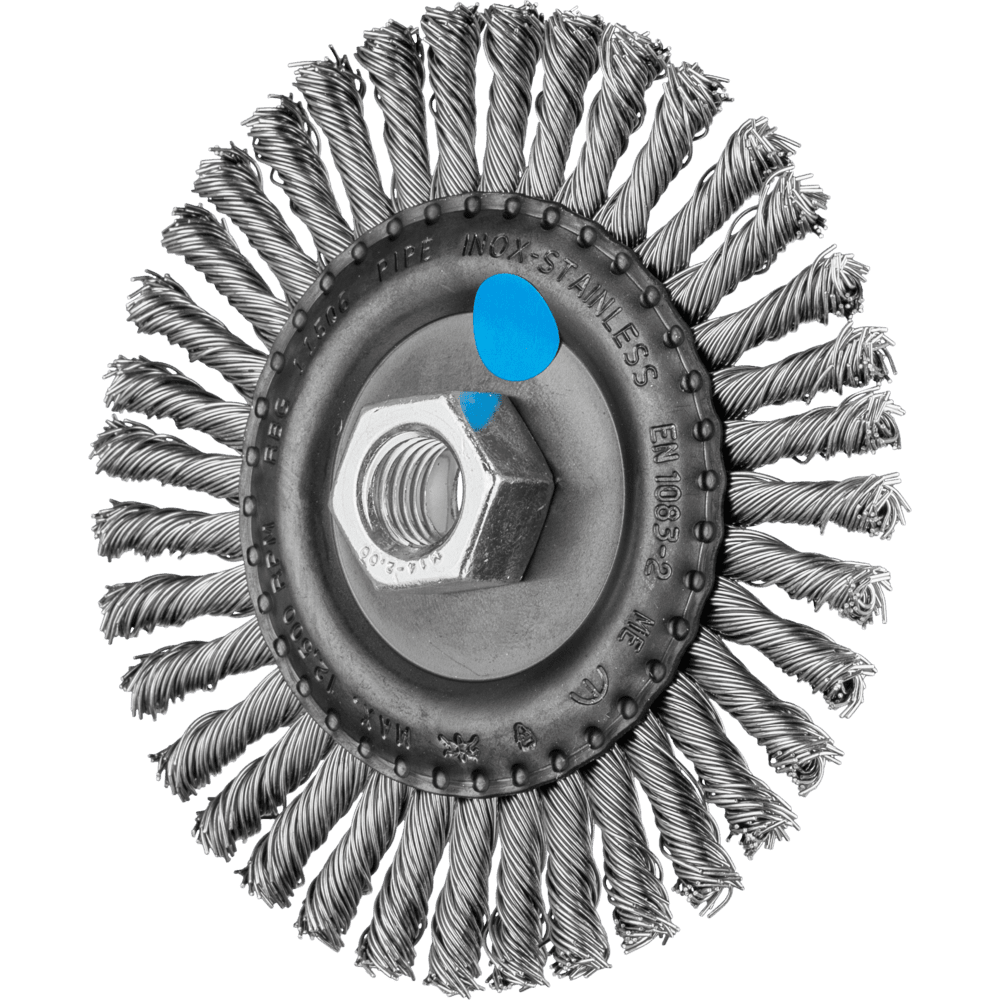 Aggressive und stabile Bürste, die hoher mechanischer Belastung standhält. Bei schweren Bürstarbeiten im Rohrleitungs-, Pipeline- und Behälterbau optimal einsetzbar. Um die besonderen Ansprüche bei der Bearbeitung von Edelstahl (INOX) zu erfüllen, verwendet PFERD TOOLS bei allen INOX-Bürsten die Drahtqualität 1.4310 (V2A). Praxiserfahrungen aus dem industriellen Umfeld bestätigen, dass sie eine sehr gute Korrosionsbeständigkeit bei optimaler Standzeit aufweist. Alle PFERD TOOLS Bürsten mit INOX-Besatz sind blau gekennzeichnet und für den Einsatz auf allen Edelstählen (INOX), wie z. B. V4A, geeignet. Die Drahtqualität 1.4310 neigt bei Kaltverfestigung zu ferromagnetischem Verhalten, das heißt, sie wird von Magneten angezogen.;Ursache hierfür ist eine Gefügeveränderung, die durch Verformung, z. B. während des Drahtziehens, hervorgerufen wird. Dies hat keinen Einfluss auf die Qualität und Korrosionsbeständigkeit des INOX-Besatzes. Er behält seine korrosionsbeständigen Eigenschaften. Edelstahldraht (INOX) hält Temperaturen bis 450 °C stand.