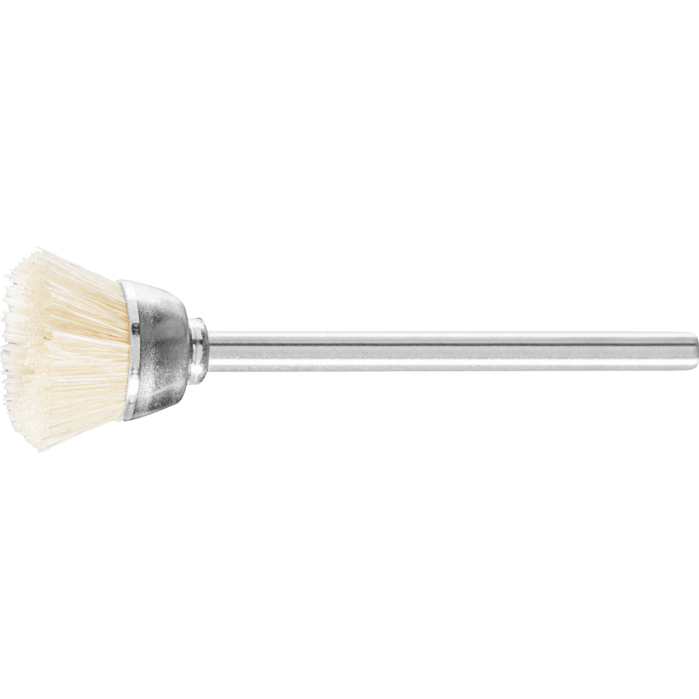 Für leichte Bürstarbeiten wie Entgraten, Reinigen und Polieren geeignet. Aufgrund des stirnseitigen Einsatzes mit der gesamten Bürstenoberfläche besonders für Bürstarbeiten auf kleinen Flächen geeignet. PFERD TOOLS bietet ein breites Programm an Miniaturbürsten für Präzisionsarbeiten an. Diese können auf Biegwellenantrieben, Mikromotoren oder Elektroantrieben eingesetzt werden. Bürsten mit Naturborsten (tierischem Haar) sind vor allem für leichte Reinigungs- und Entstaubungsarbeiten sowie zum Polieren (in Verbindung mit Polierpasten) geeignet. Borste ist weniger flexibel und härter als Bürsten mit Ziegenhaarbesatz. Naturborsten halten Temperaturen bis 150 °C stand.