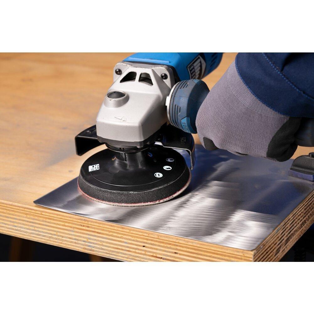 Mit dem Klettrondenhalter können Klettronden auf handelsüblichen drehzahlregelbaren oder langsam laufenden Winkelschleifern mit M14-Aufnahme eingesetzt werden.