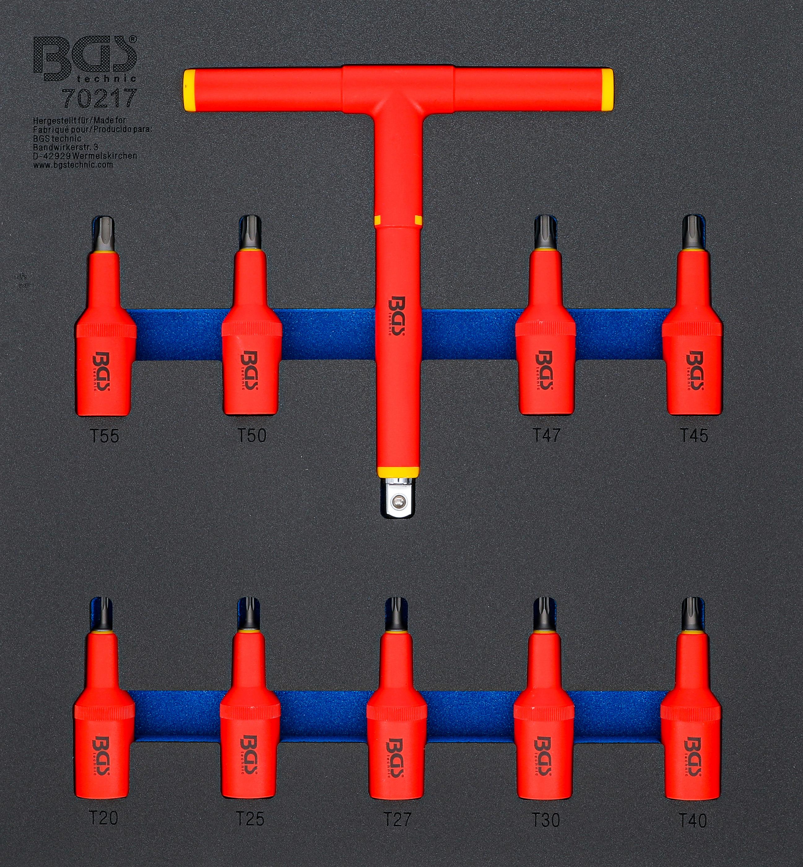 Werkstattwageneinlage 2/3: VDE-Bit-Einsatz-Satz | Antrieb Innenvierkant 12,5 mm (1/2") | T-Profil (für Torx) T20 - T55 | 10-tlg. BGS70217
